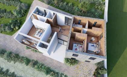 Le bien est vendu avec un permis de construire déjà obtenu et un projet architectural complet pour une villa moderne sur deux niveaux, avec une emprise au sol de 108 m².