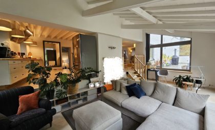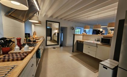Un cuisine équipée ouverte sur le séjour d’environ 20m² [équipements: taques au gaz – four – lave-vaisselle – double évier – hotte / la cuisine ne dispose pas de frigo/congélateur ou micro-ondes];