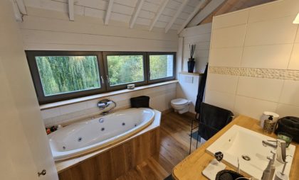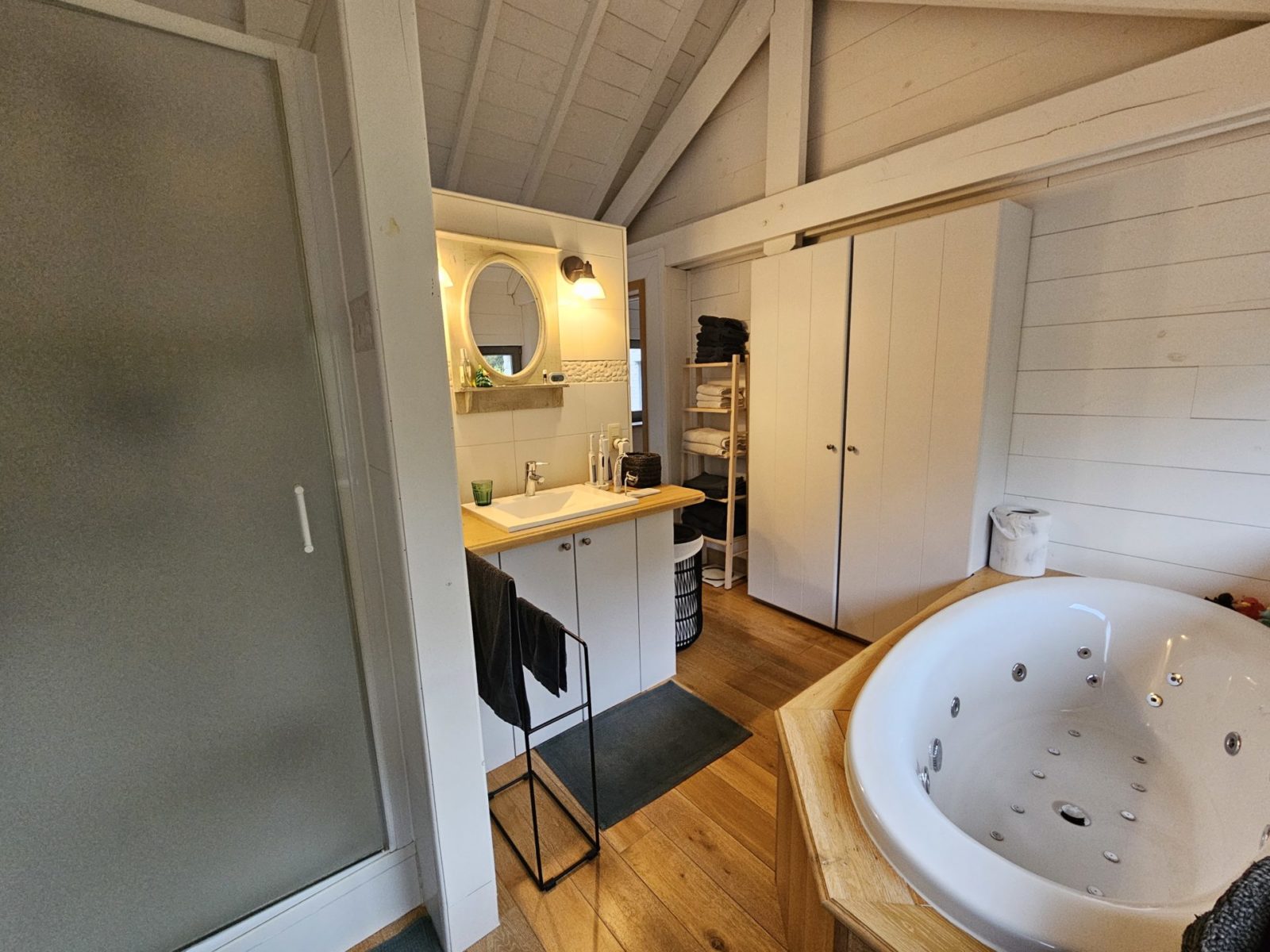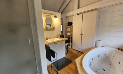 Une suite principale d’environ 30m² avec un espace chambre **Ch.1** (actuellement l’espace chambre sert de bureau) avec des placards encastrés et une salle de bain complète [bain jacuzzi, douche, évier simple, WC];