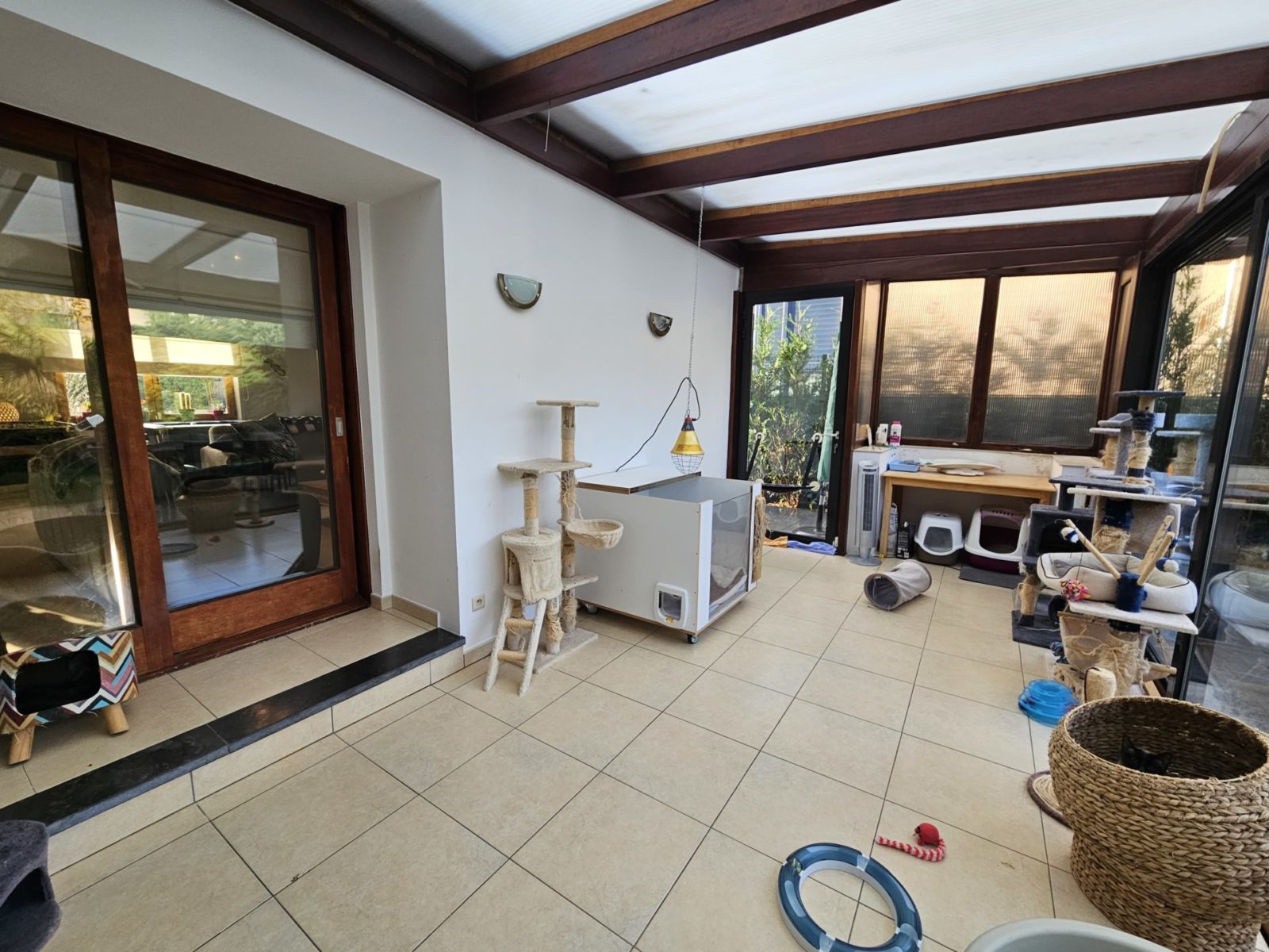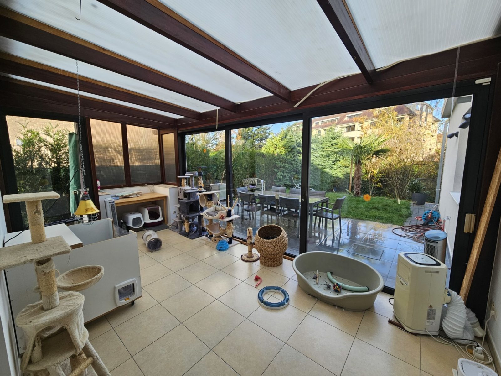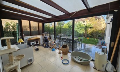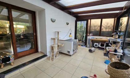 Attenante au séjour, vous trouverez une véranda, aujourd’hui utilisée comme espace pour les chats. Elle nécessite une rénovation, mais offre un beau potentiel pour devenir un véritable lieu de détente. Elle donne accès à une terrasse et à un jardin en contrebas, parfait pour profiter des beaux jours.